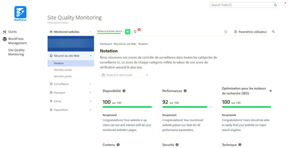 Avec Site Quality Monitoring (SQM) intégré à cPanel, vous bénéficiez d’un contrôle continu de la santé de votre site WordPress. Plus besoin d’empiler des plugins ou services externes : tout est centralisé dans votre espace RunPress.