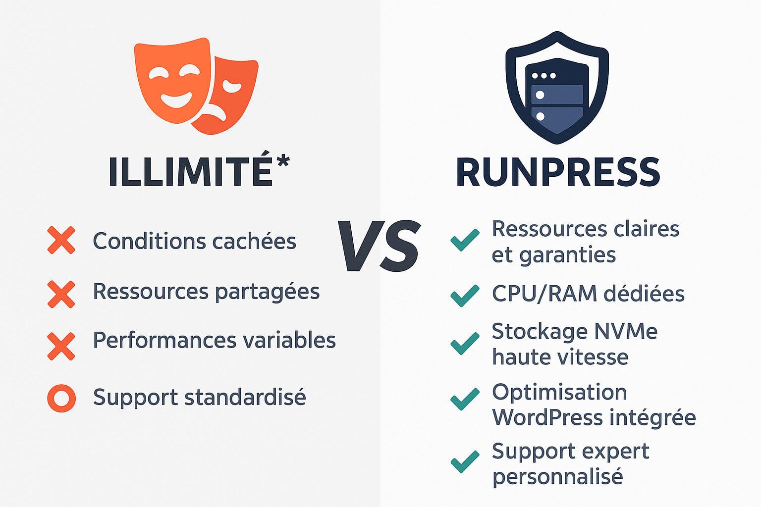 Chez RunPress, nous avons fait le choix de la transparence et de la performance : pas d’illimité, mais des ressources clairement définies, adaptées à vos besoins. Et c’est une bonne nouvelle pour vous.