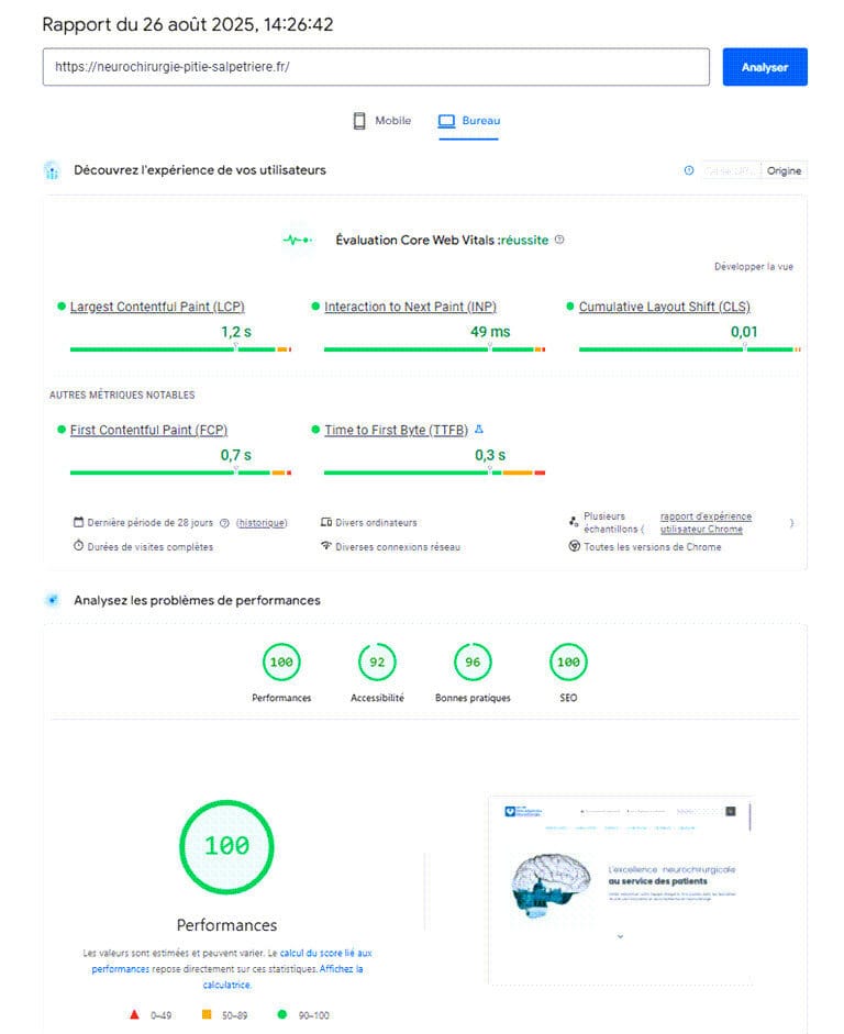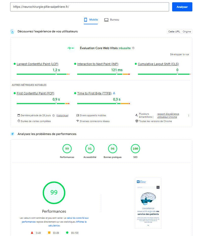 Notre infrastructure est optimisée pour atteindre des scores verts (90+) sur la majorité des sites vitrines WordPress, à condition d’avoir un thème et des plugins correctement configurés.
