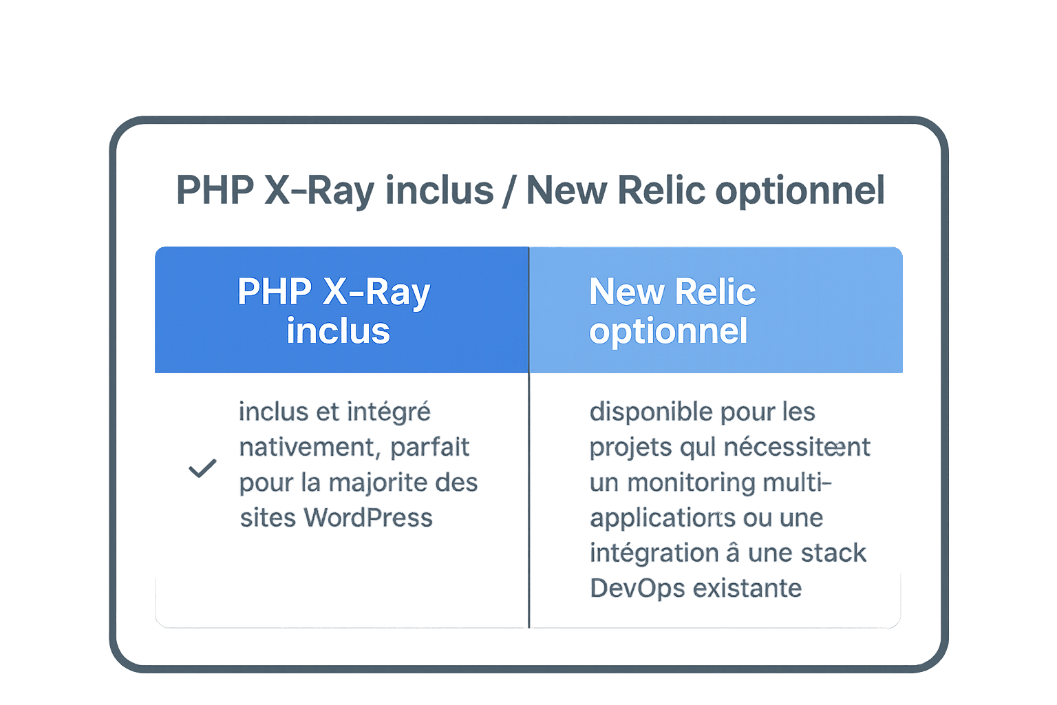 - Économie : pas besoin d’abonnement supplémentaire pour PHP X-Ray, ni d’expertise DevOps coûteuse.